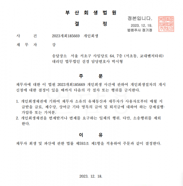 개인회생신청사건의 금지명령결정문