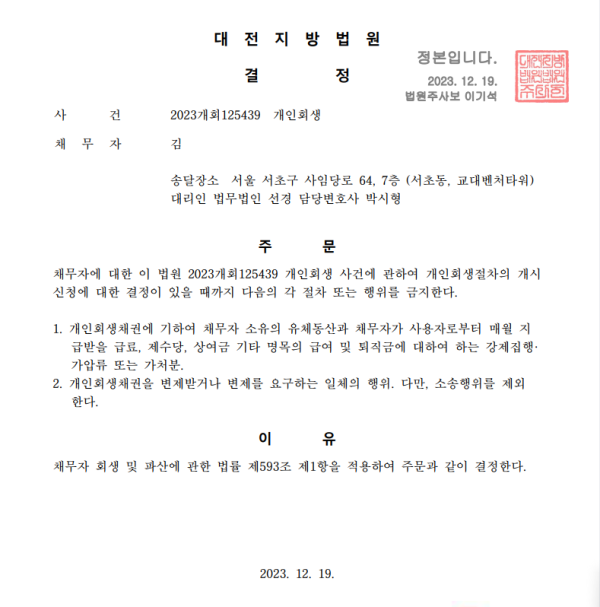 개인회생신청사건의 금지명령결정문