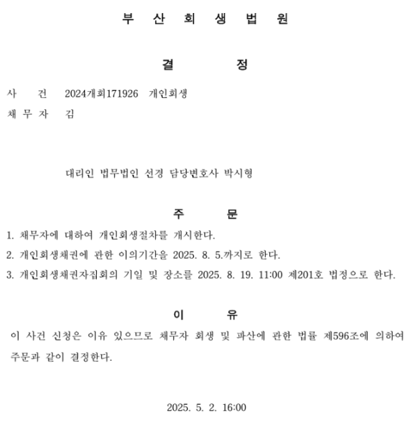 개인회생신청사건의 개시결정문