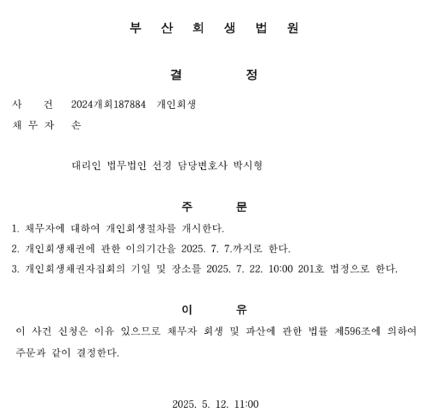 개인회생신청사건의 개시결정문