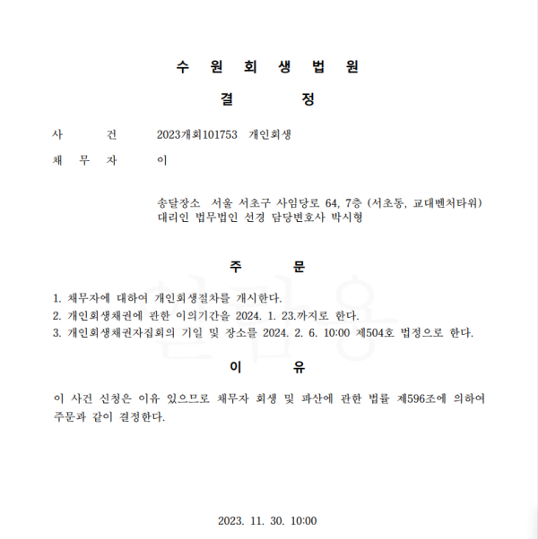 개인회생신청사건의 개시결정문