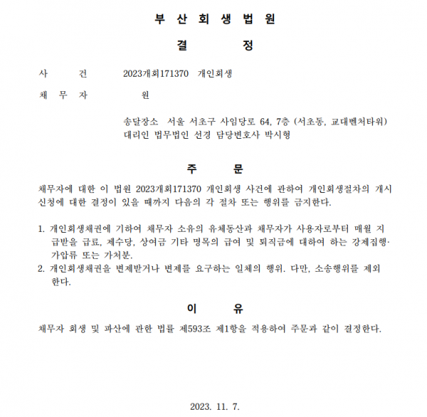 개인회생신청사건의 금지명령결정문