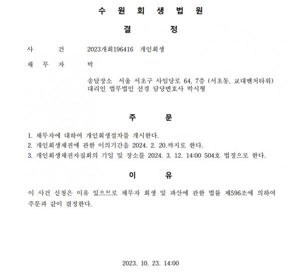 개인회생신청사건의 개시결정문