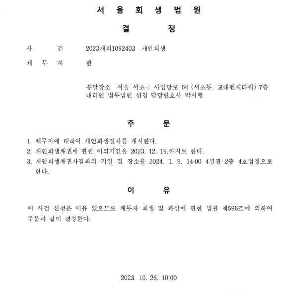 개인회생신청사건의 개시결정문