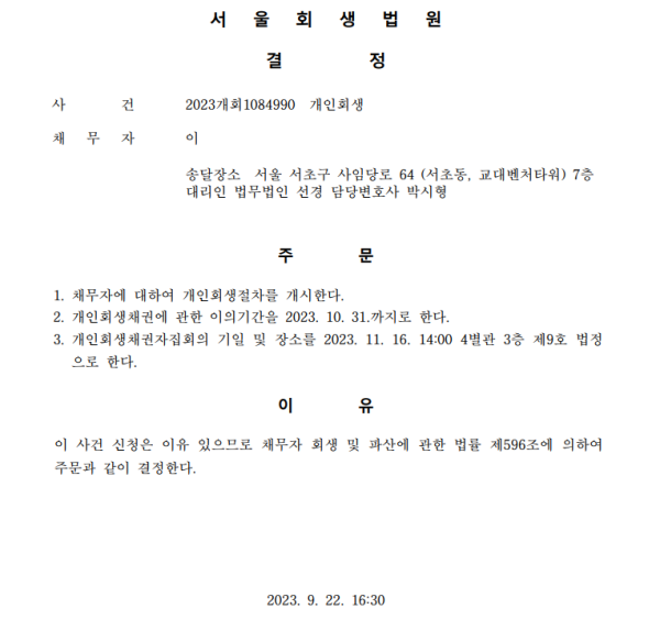 개인회생신청사건의 개시결정문