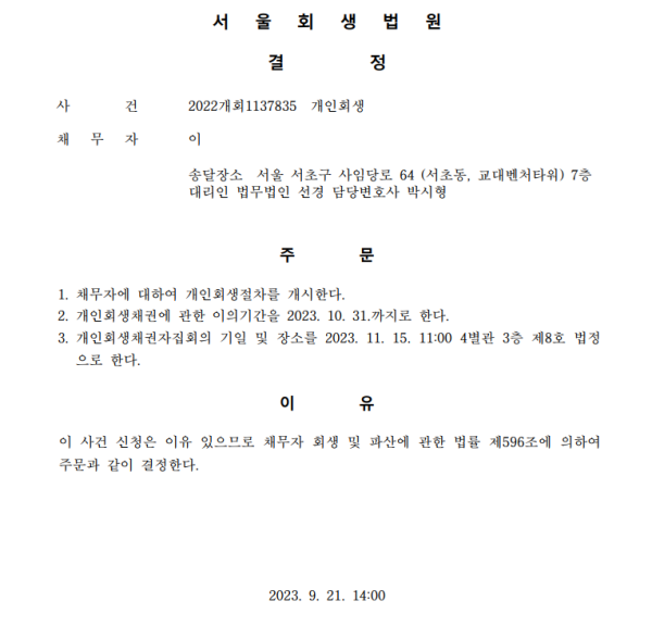 개인회생신청사건의 개시결정문
