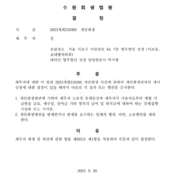 개인회생신청사건의 금지명령결정문
