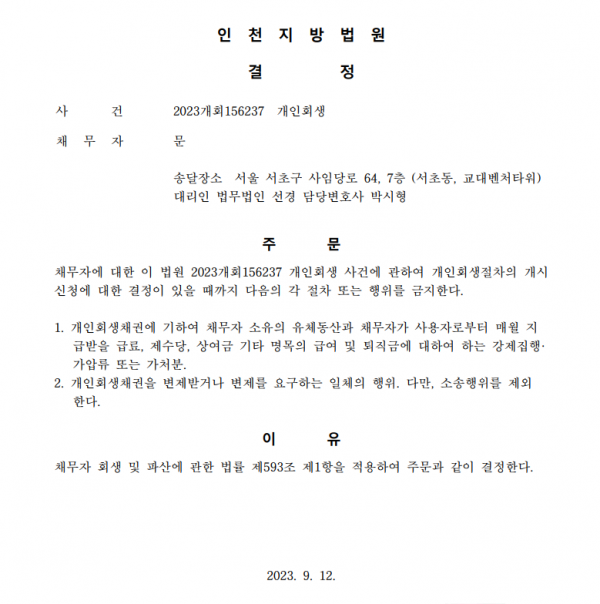 개인회생신청사건의 금지명령결정문