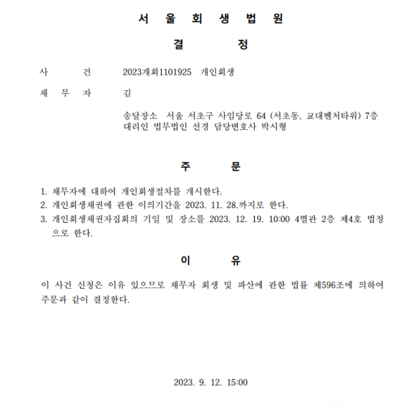 개인회생신청사건의 개시결정문