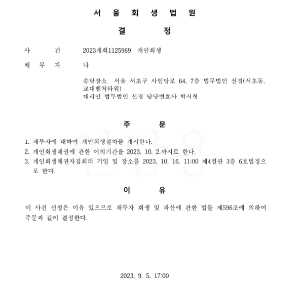 개인회생신청사건의 개시결정문