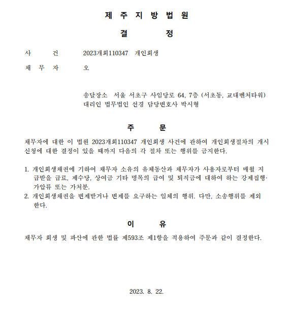 개인회생신청사건의 금지명령결정문