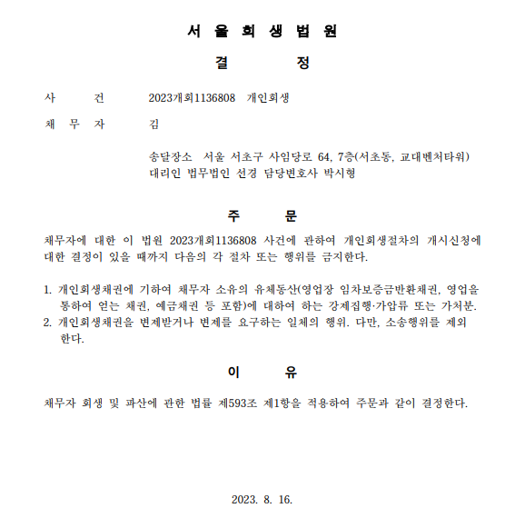 개인회생신청사건의 금지명령결정문