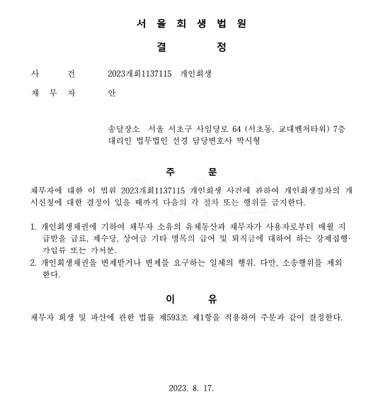 개인회생신청사건의 금지명령결정문