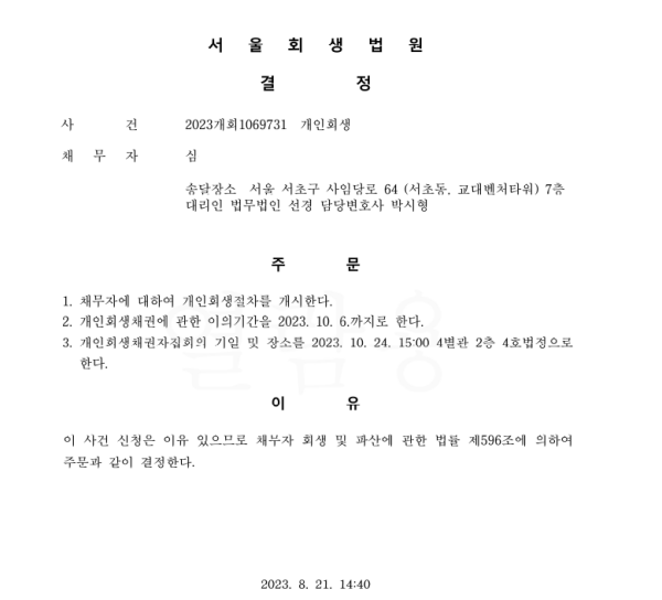 개인회생신청사건의 개시결정문