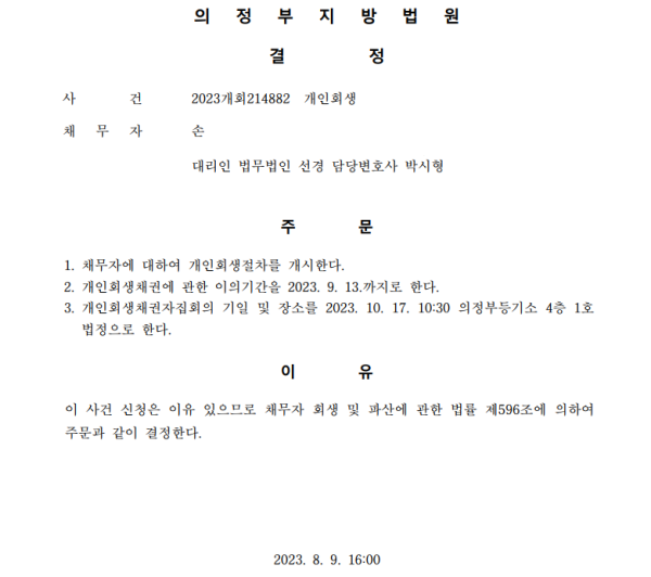 개인회생신청사건의 개시결정문
