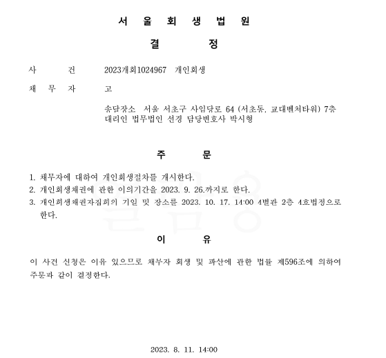 개인회생신청사건의 개시결정문