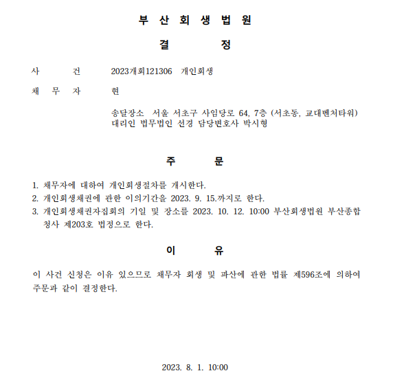 개인회생신청사건의 개시결정문