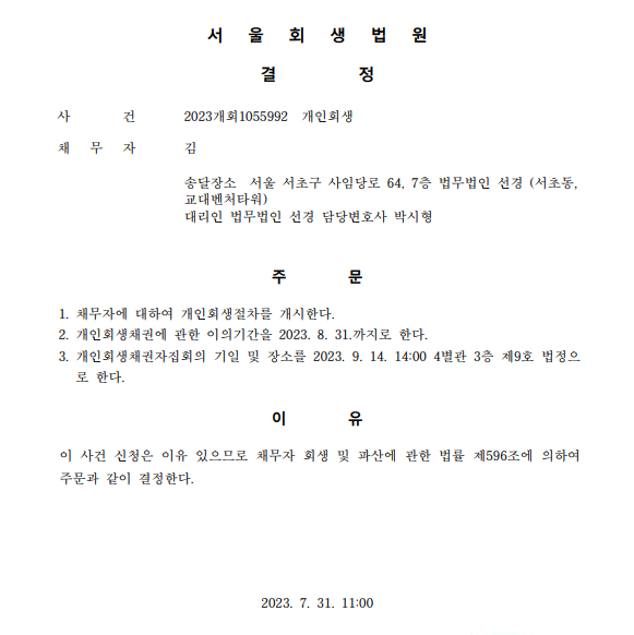 개인회생신청사건의 개시결정문