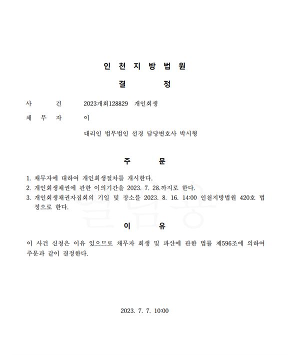 개인회생신청사건의 개시결정문
