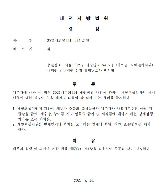 개인회생신청사건의 금지명령결정문