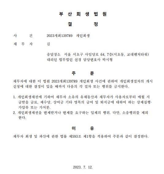 개인회생신청사건의 금지명령결정문