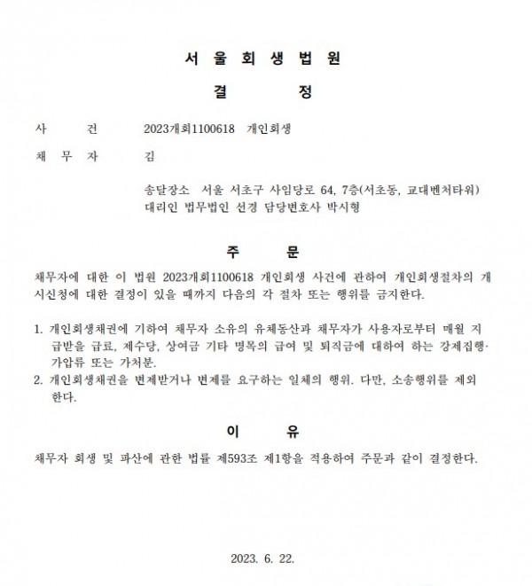 개인회생신청사건의 금지명령결정문