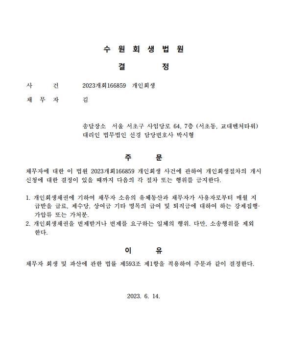 개인회생신청사건의 금지명령결정문