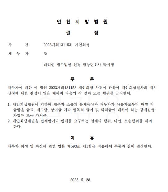 개인회생신청사건의 금지명령결정문