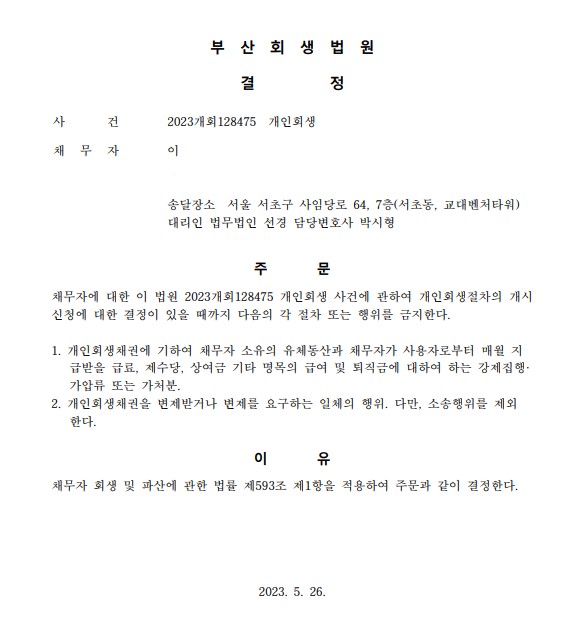 개인회생신청사건의 금지명령결정문