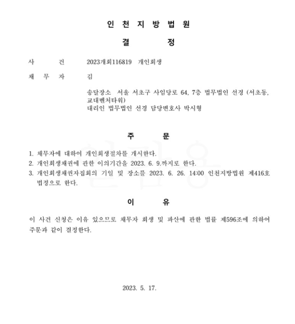 개인회생신청사건의 개시결정문