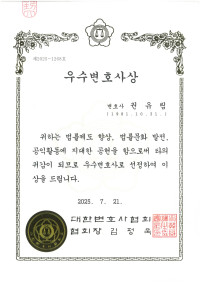 법무법인 선경 권유림 변호사가 제30회 우수변호사로 선정되었습니다. 대한변호사협회는 정의·인권, 법률제도 향상, 모범적 변…