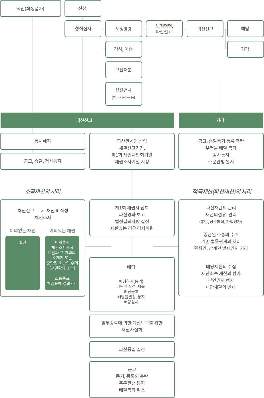 기업이 지급불능 또는 재정적 파탄상황에 처하여 회사의 채무를 상환할 수 없는 경우, 법원에 법인파산절차를 신청하여 파산선고 결정을 받은 다음 법원이 선임한 파산관재인이 회사의 모든 재산을 환가하여 채권자들에게 배당하고 회사는 청산시키는 절차